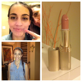 It is L'oreal's Fairest Nude (#800) and it is available at any drugstore. As you can see in the picture it is very subtle and has a tiny bit of pink in it. Plus I LOVE how amazing it feels on the lips, very creamy and smooth. To enhance the look you can always put a lip gloss on top and add more color.